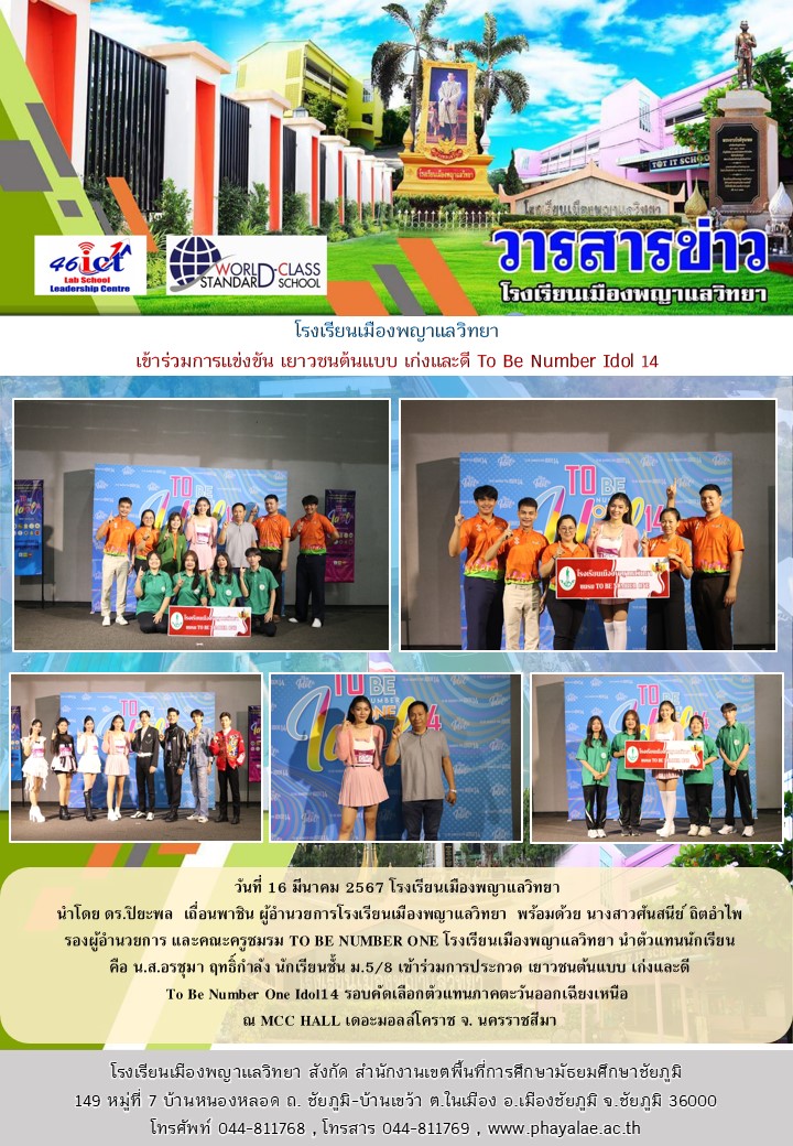 16 มีนาคม 2567 โรงเรียนเมืองพญาแลวิทยา นำตัวแทนนักเรียน คือ นางสาวอรชุมา ฤทธิ์กำลัง นักเรียนชั้น ม.5/8 เข้าร่วมการประกวดเยาวชนต้นแบบ เก่งและดี TO BE NUMBER ONE IDOL14 รอบคัดเลือกตัวแทนภาคตะวันออกเฉียงเหนือ