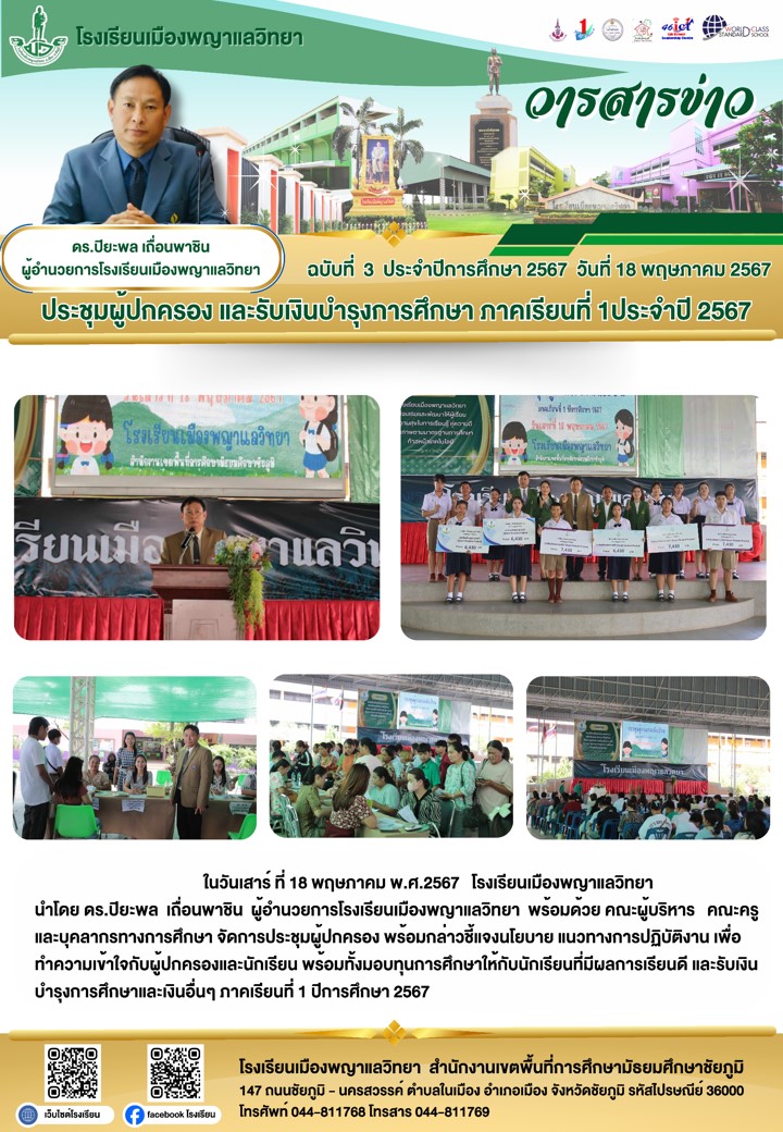 18 พฤษภาคม 2567 โรงเรียนเมืองพญาแลวิทยา จัดการประชุมผู้ปกครอง รับเงินบำรุงการศึกษาและเงินอื่นๆ ภาคเรียนที่ 1 ประจำปีการศึกษา 2567