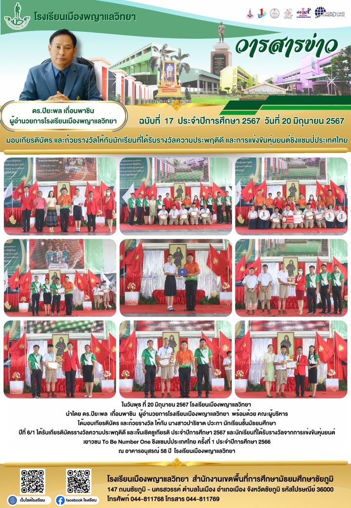 20 มิถุนายน 2567 มอบเกียรติบัตรและถ้วยรางวัลให้กับนักเรียน