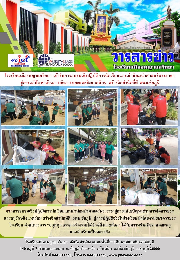จากการอบรมเชิงปฏิบัติการนักเรียนแกนนำน้อมนำศาสตร์พระราชาสู่การแก้ไขปัญหาด้านการจัดการขยะ และอนุรักษ์สิ่งแวดล้อม สร้างจิตสำนึกที่ดี สพม.ชัยภูมิ สู่การปฏิบัติจริงในโรงเรียน นำโดยงานธนาคารขยะโรงเรียน ด้วยโครงการ “ปลุกคุณธรรม สร้างรายได้ รักษ์สิ่งแวดล้อม