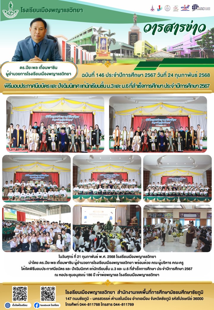 21 กุมภาพันธ์ 2568 พิธีมอบประกาศนียบัตร และ ปัจฉิมนิเทศ แก่นักเรียนชั้น ม.3 และ ม.6 ที่สำเร็จการศึกษา ประจำปีการศึกษา 2567