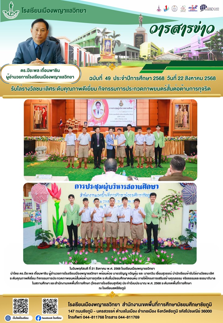 22 สิงหาคม 2568 รับโล่รางวัลชนะเลิศระดับคุณภาพดีเยี่ยม กิจกรรมการประกวดภาพยนตร์สั้นต่อต้านการทุจริต