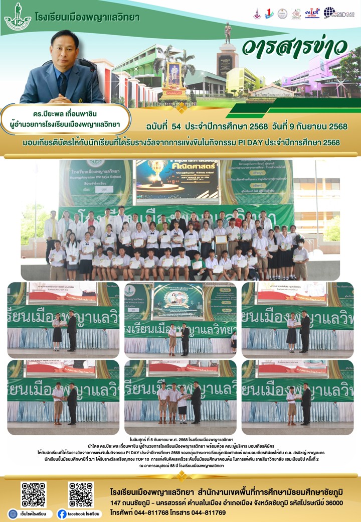 5 กันยายน 2568 มอบเกียรติบัตรให้กับนักเรียนที่ได้รับรางวัลจากการแข่งขันในกิจกรรม PI DAY ประจำปีการศึกษา 2568