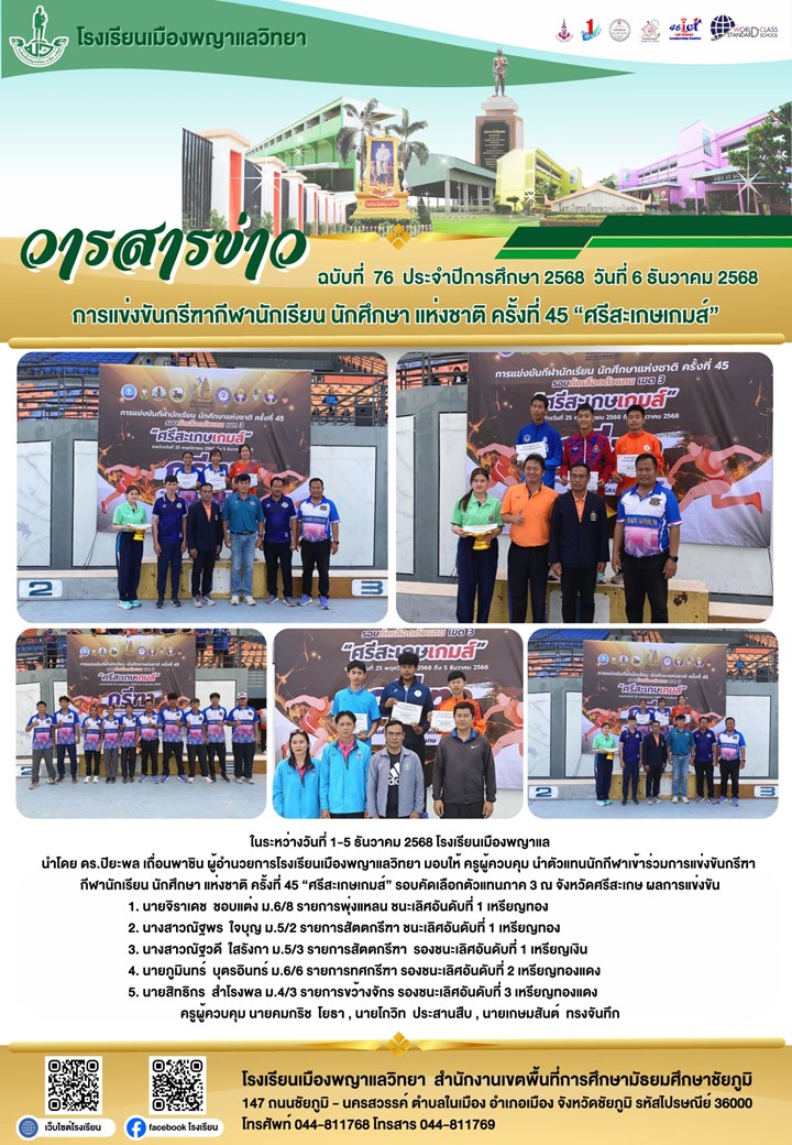 6 ธันวาคม 2568 การแข่งขันกรีฑากีฬานักเรียน นักศึกษา แห่งชาติ ครั้งที่ 45 “ศรีสะเกษเกมส์”