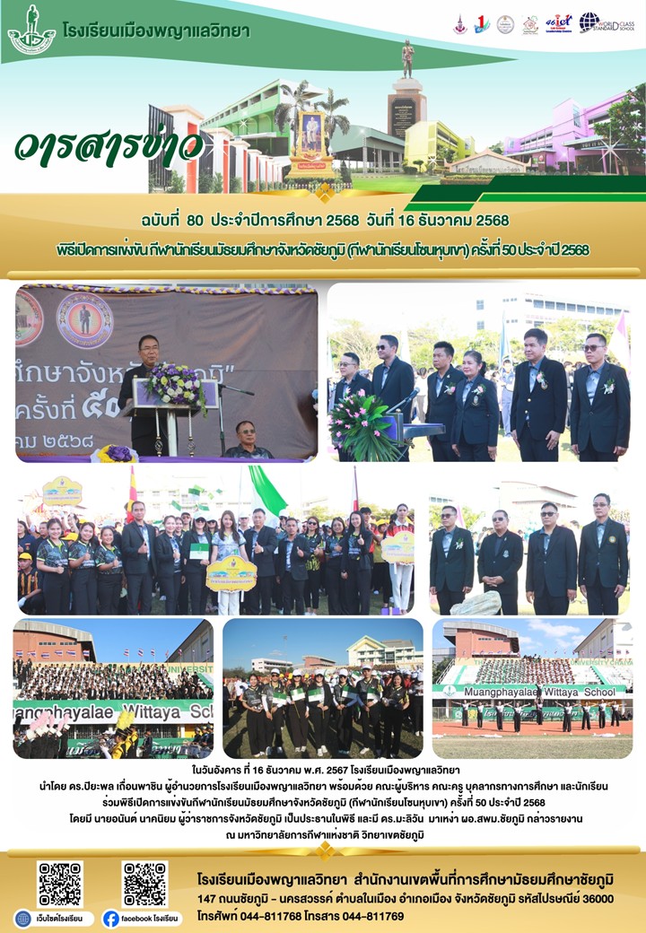 16 ธันวาคม 2568 พิธีเปิดการแข่งขัน กีฬานักเรียนมัธยมศึกษาจังหวัดชัยภูมิ (กีฬานักเรียนโซนหุบเขา) ครั้งที่ 50 ประจำปี 2568